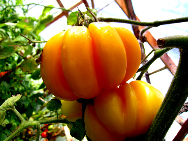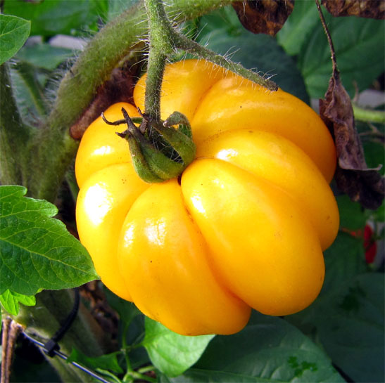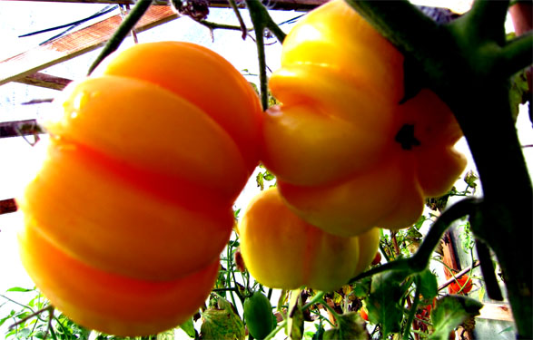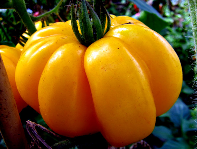 flach gelblich runde stark gerippte bis zu 200 g schwere Tomate - sehr schöne Optik