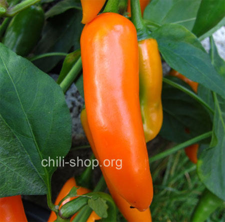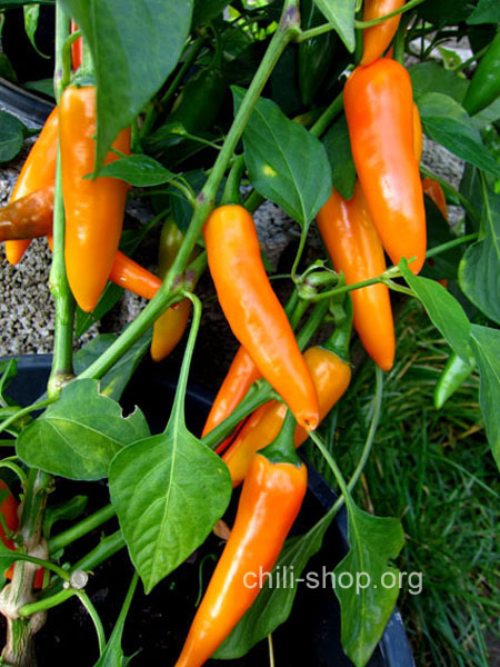 sehr reichtragende Sorte mit mittlerer Schärfe die Schoten leuchtend orange
