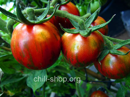 Stabtomate mit optisch sehr schönen etwa 100 g schweren mehrfarbigen Früchten - sehr feste Schale